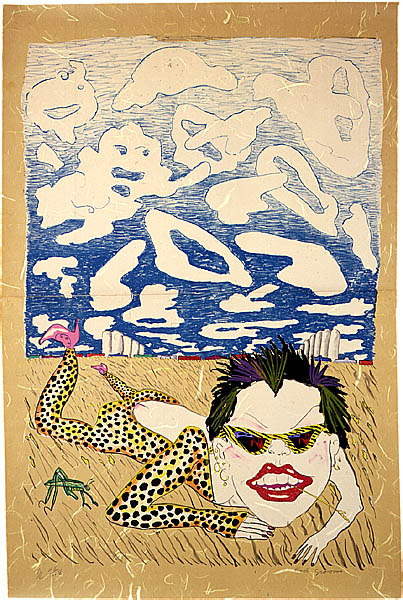 There was Red Grooms, his girlfriend Suze Rotolo's favorite artist: "He incorporated every living thing into something and made it scream÷everything side by side created equal÷old tennis shoes, vending machines, alligators that crawled through sewers.... Brahman bulls, cowgirls, rodeo queens and Mickey Mouse heads, castle turrets and Mrs. O'Leary's cow, creeps and greasers and weirdos and grinning, bejeweled nude models.... Subconsciously, I was wondering if it was possible to write songs like that."